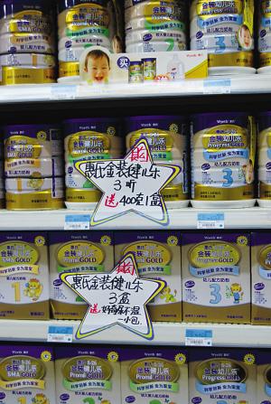 但昨天在一些商場(chǎng)看到的惠氏促銷廣告上赫然標(biāo)注著:“購(gòu)買900克的三聽(tīng),送400克的一盒。”黃女士跟記者算這筆賬:“一聽(tīng)金裝幼兒樂(lè)第三階段奶粉漲了17元,如果買三盒,就等于貴了51元,但贈(zèng)送一盒400克裝的,價(jià)值56元(漲價(jià)前),算起來(lái),等于沒(méi)漲價(jià)。只是要多買幾瓶罷了。但現(xiàn)在是夏天,也不知道奶粉多買了能不能保存。”