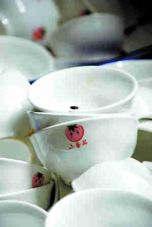加工車間的門窗開著,洗好的碗碟被一股腦兒擠進一個個粘著一層油漬的箱子里,蒼蠅圍繞著這些碗碟上下紛飛。工作臺上,四名女工正在給裝進塑料袋的碗碟封口。當執(zhí)法人員搬開一臺塑封機時,3只蟑螂一下子鉆進碗碟堆里。