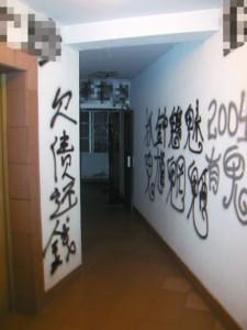 “樓層里有個小男孩因為害怕這些字,哭鬧著不肯回家,現(xiàn)在住到了外婆家,不愿再回來。我每天晚上走出電梯時,看到這些字,也會覺得毛骨悚然。 ”徐小姐說,由于這些詛咒語的存在,20層的居民仿佛置身于恐怖片的場景中,一些膽小的女士和孩子甚至產(chǎn)生了嚴(yán)重的心理障礙,目前該樓層的居民都生活在一種很壓抑的環(huán)境中,希望有關(guān)方面能盡早解決此事。