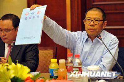 11月30日,農夫山泉股份有限公司董事長鐘睒睒在新聞發布會上展示有關部門出具的同批次產品的檢驗合格報告。新華社記者王定昶攝