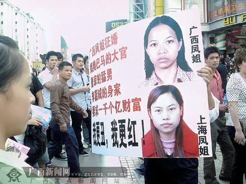 4月11日下午,一男子在南寧市裕豐商廈門前,舉出“廣西鳳姐征婚”的廣告牌,聲稱要為自己的一位親戚——“廣西版鳳姐”征婚。“廣西鳳姐”故作神秘沒現身,但其開出的征婚條件卻“雷倒”了眾多圍觀市民。