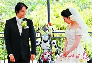 16日,在日本東京,一對新人在特殊的“牧師”前許下相伴一生的諾言。這位“牧師”是一臺名叫i-Fairy的機器人。i-Fairy原本在博物館和會展中心引導游客。16日,工程師給它帶上花環并輸入扮演牧師的程序,負責將這對新人送入婚禮殿堂。