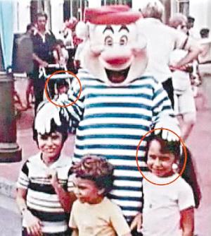 唐娜(前方圈內)5歲時在迪斯尼樂園拍攝的照片,她的“未來丈夫”亞歷克斯(后方圈內)坐在折疊式童車里。