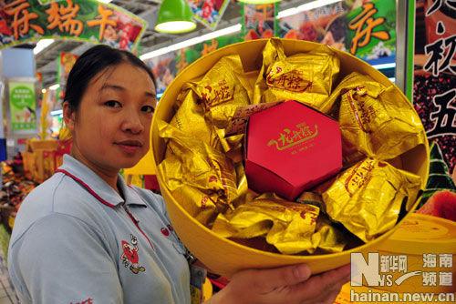 6月9日,海南?谀吵袖N售人員正在擺放粽子禮盒。