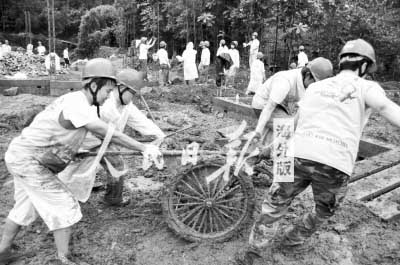 7月底的四川悶熱得很,幾乎每天的氣溫都在37攝氏度左右,即使是什么都不干,都會出汗。再加上為了避免曬傷,隊員們都穿著長袖上衣和長褲工作,更是熱得大汗淋漓。后來,趕上3天都在下雨,為了不延誤工期,大家就穿著雨衣堅持工作。志愿者們的想法很簡單:“因為我們不是工人,是志愿者,所以才要在雨天繼續工作,抓緊時間完成任務。我們想為在冬天來臨之前,讓更多的災民搬出簡易房,住進新房子盡一份力!”