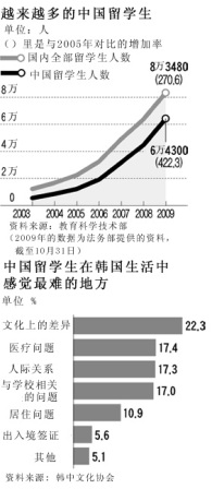 去海外留學(xué)的韓國(guó)留學(xué)生在2005年到2009年之間增加了26.5%的情況相反,相同時(shí)期內(nèi)國(guó)內(nèi)的外國(guó)留學(xué)生增加了約270%。這一期間內(nèi)中國(guó)留學(xué)生人數(shù)激增了422%。