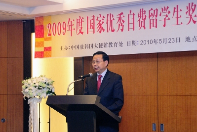艾宏歌參贊介紹了“國家優秀自費留學生獎學金”設立的背景和頒獎情況。他說,自2003年實施以來,總共有1900余名在外優秀留學人員獲獎。2009年度獎勵規模達497人,其中在韓自費留學生13人獲獎。他希望同學們牢記張大使的囑托,奮發努力,為祖國的建設和中韓關系發展發揮積極作用。