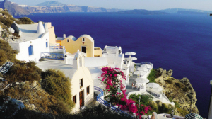 走在安靜的空巷中,一面是雪白的墻壁,在正午的陽光下晃人眼,教堂明藍色的拱型圓頂和頂上的十字架在陽光下沉靜而安詳。島上人家矮矮的圍墻里探出一叢叢鮮花的笑靨,姹紫嫣紅的點綴讓眼前的畫面更是美不勝收。強烈的色彩對比,峭壁和大海形成巨大反差,這般如詩如畫的情景叫人難忘。