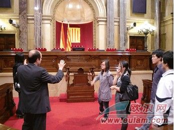 進(jìn)入議會大廳以后,一名議會工作人員負(fù)責(zé)接待留學(xué)生,他詳細(xì)地向留學(xué)生們介紹了議會的歷史以及現(xiàn)況:加泰羅尼亞議會大樓原來是專門建立給西班牙國王和王后在巴塞羅那的寢宮,但建成以后王后沒有接受這個宮殿作為她的寢宮,所以該大樓也一直沒有作為宮殿用過。之后就作為存放武器和軍人的居住點(diǎn),在弗拉明戈時期都是作為武力和壓迫的象征。該大樓從1932到1936年首次作為加泰羅尼亞議會,現(xiàn)在民主時代也就是從1980年再次作為議會使用。加泰羅尼亞各黨派議會議員現(xiàn)在都在此上班,加泰羅尼亞議會是審批加區(qū)各大小法律法規(guī)的地方,密切關(guān)系加區(qū)民眾民生。之后解說員帶領(lǐng)留學(xué)生們參觀了加議會各個大廳及各個會議室,向留學(xué)生們介紹了每個廳在議會的作用,正如我們經(jīng)常在電視上看到的,比如召開記者發(fā)布會的記者大廳,議會議員表決大廳等等。議會的建筑設(shè)計(jì)風(fēng)格即富麗堂皇又富有當(dāng)?shù)亟ㄖL(fēng)格氣息。