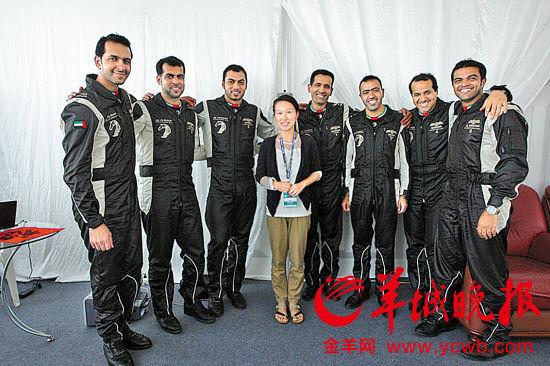 羊城晚報記者與阿聯酋騎士飛行表演隊全部飛行員合影