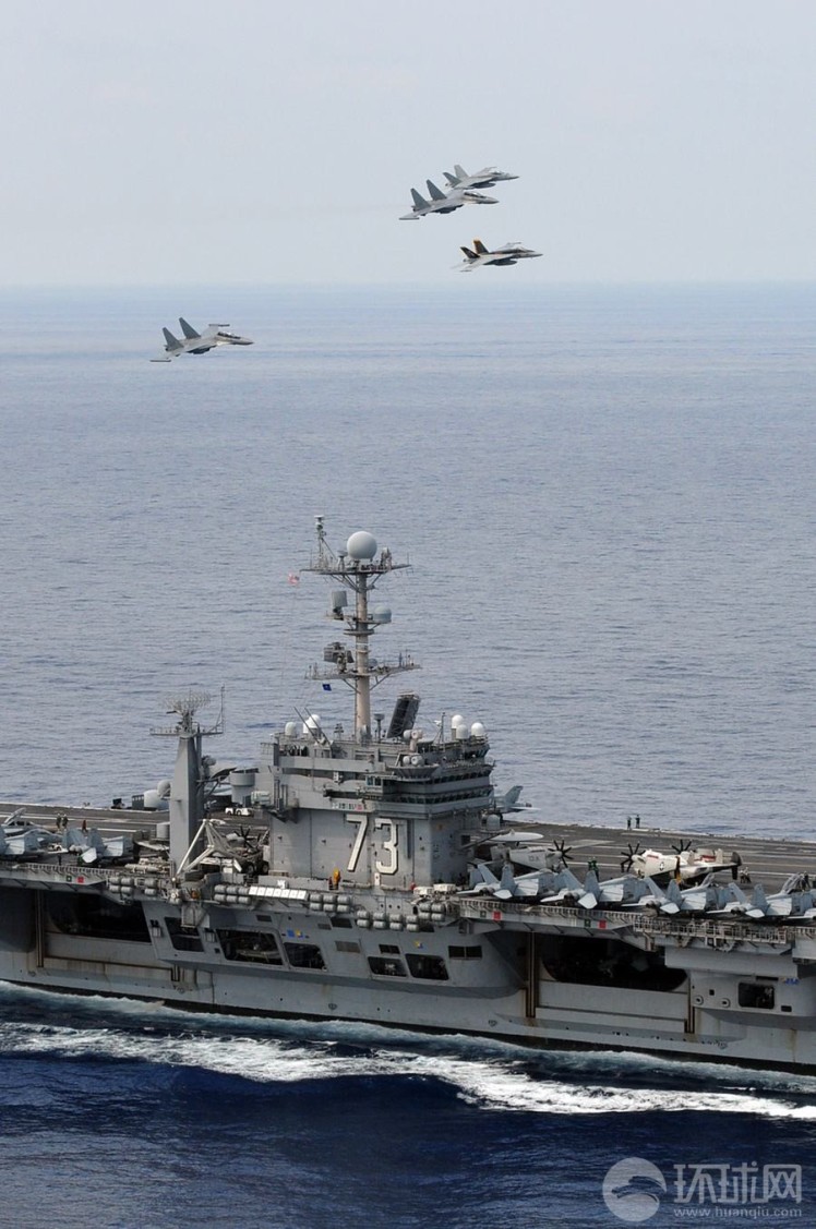 馬來西亞海軍的蘇-30戰(zhàn)機(jī)與美國(guó)海軍的F/A-18戰(zhàn)斗機(jī)組成編隊(duì)從華盛頓號(hào)航母上空飛過