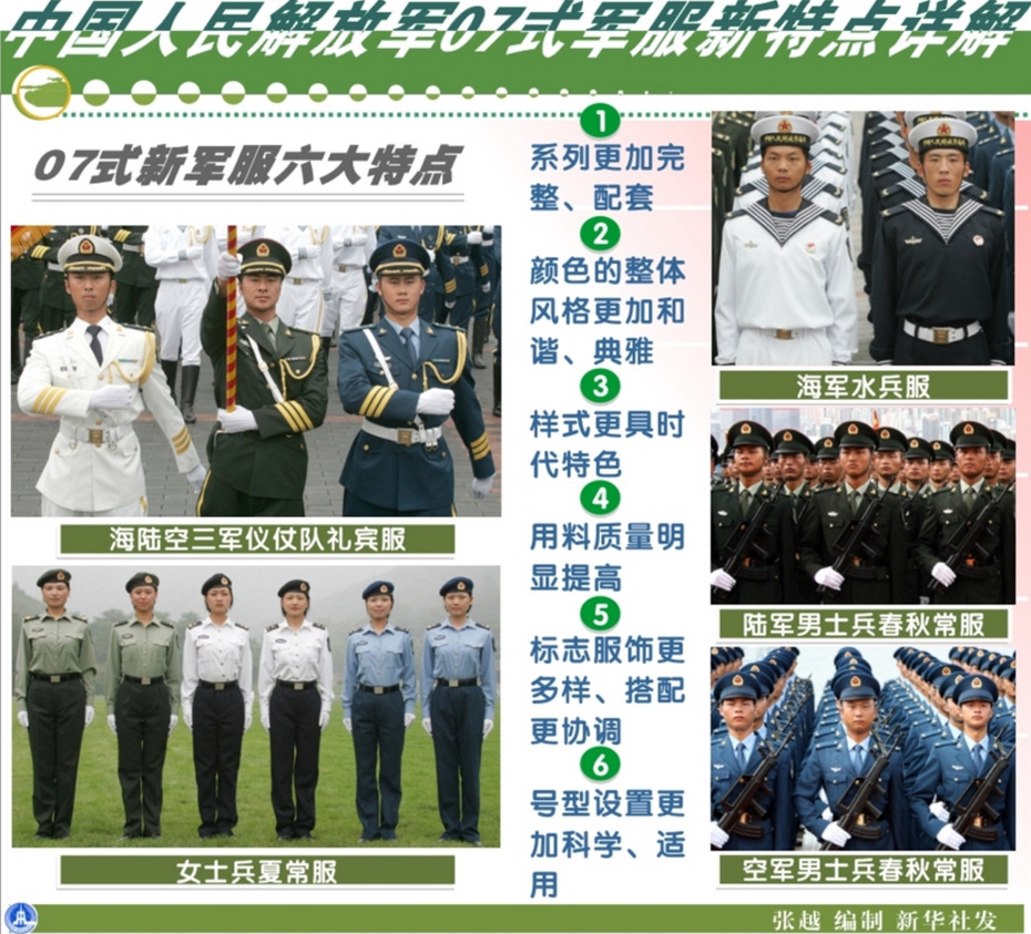 這是中國人民解放軍07式軍服新特點詳解的圖表。2007年7月起,全軍官兵陸續穿上07式軍服。這次我軍歷史上規模最大最系統的換裝,涉及禮服、常服、作訓服和標志服飾4個系列700多個品種。新華社發