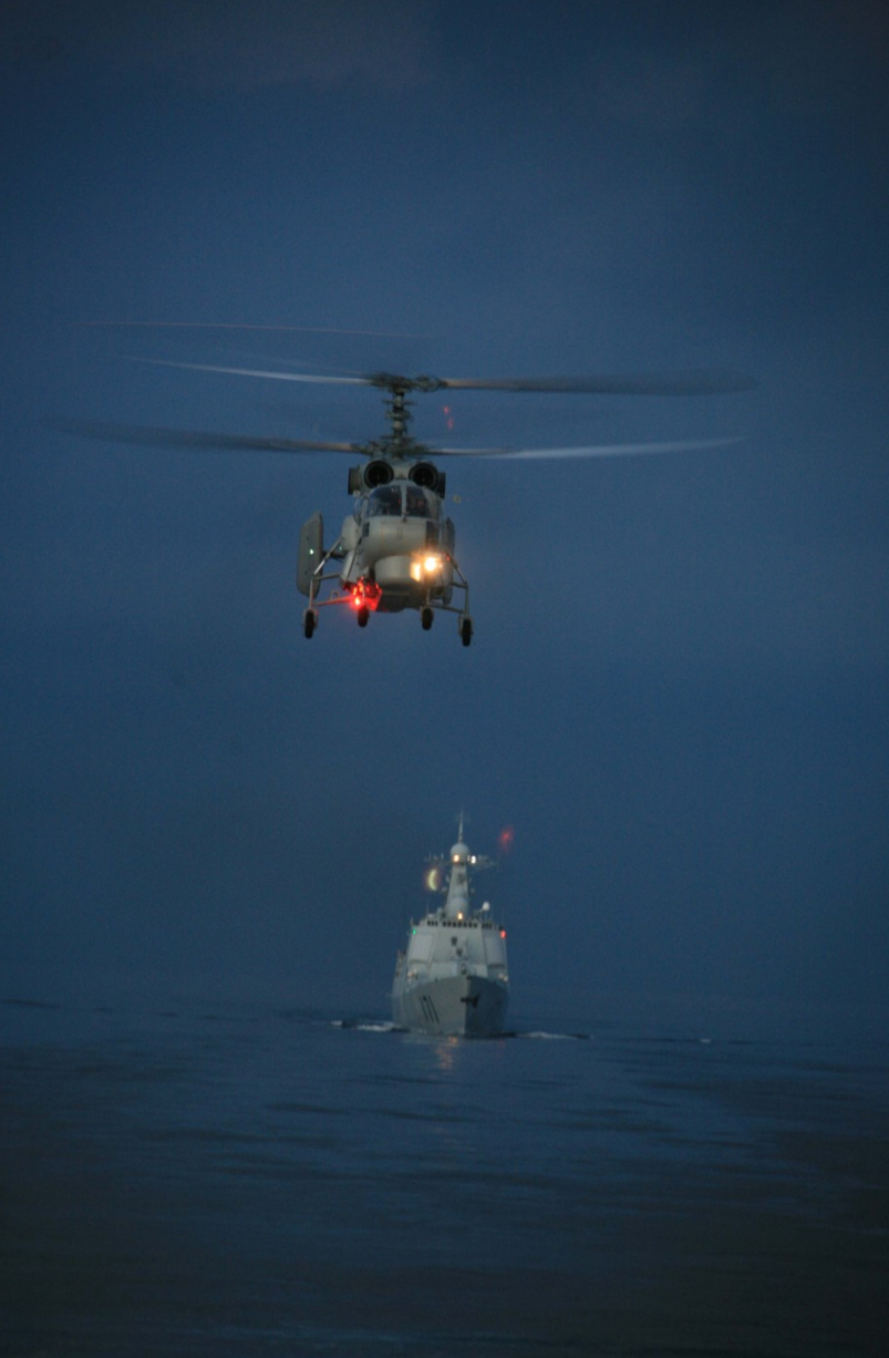 2008年12月28日夜,中國赴亞丁灣、索馬里海域護航編隊組織夜間直升機行進間著艦訓練。越來越多的中國軍人,正在以各種方式走出國門,走上國際舞臺。聯合國維和、國際人道主義救援、海外護航、中外軍隊聯演聯訓、軍事友好訪問,處處展現出和平之師的良好形象。2008年12月26日,中國海軍艦艇編隊首次遠赴亞丁灣、索馬里海域,為過往商船護航。截至2012年7月,先后有12批護航編隊參加護航任務,安全護送474批共4727艘中外船舶。新華社發