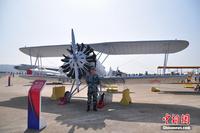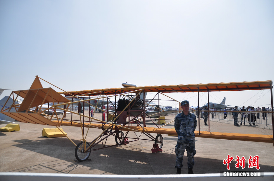 馮如2號(hào)飛機(jī)是中國(guó)人自行設(shè)計(jì)、制造并成功試飛的第一架飛機(jī)。該機(jī)于1911年1月18日由“中國(guó)航空之父”--馮如試飛成功。航展上展出的為1:1復(fù)制品。陳海峰 攝