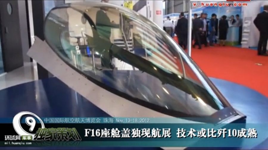 參展商英國漢堡森航空航天公司展出的F-16一體成形座艙罩(環球網視頻截圖)