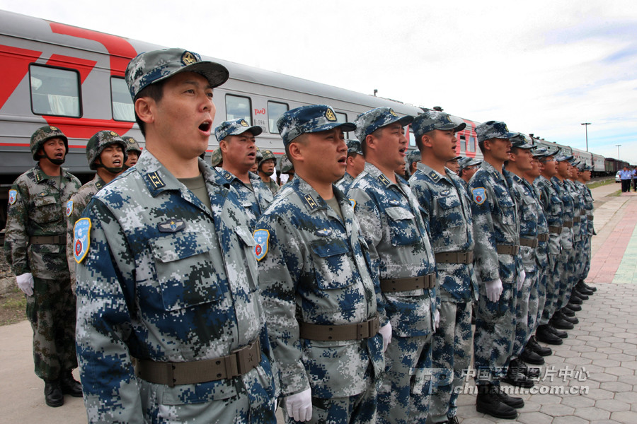 官兵意氣風發、斗志昂揚準備登上俄方專列。 曹占禮 攝
