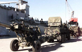 美國五角大樓發出增援海灣命令后,海軍陸戰隊奉命從杰克遜維爾海軍陸戰隊基地出發。在北卡羅萊納國家港口待命的美艦龐賽號負責運載炮兵重型裝備。