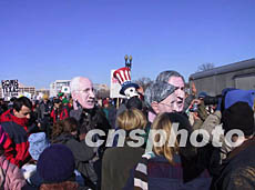 數萬美國人十八日中午在華盛頓舉行大規模反戰游行,示威者裝扮成布什、切尼、拉姆斯菲爾德“三巨頭”,諷刺他們“販賣”戰爭。作者:余東暉