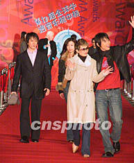 第九屆全球華語(yǔ)音樂(lè)榜中榜頒獎(jiǎng)典禮十九日晚在上海舉行,眾多內(nèi)地及港臺(tái)藝人的出席使得這屆有史以來(lái)規(guī)模最大的華人音樂(lè)評(píng)選盛會(huì)星光閃耀。圖為在頒獎(jiǎng)盛典之前,香港著名藝人梅艷芳等走過(guò)紅地毯鋪就的星光大道進(jìn)入會(huì)場(chǎng)。作者:姜煜