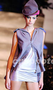 在香港舉辦的“香港青年時裝設計家創作表演賽2003”上,模特展示青年時裝設計師楊展的獲獎作品。洪少葵 攝