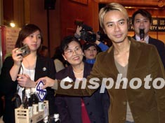 歌星李克勤1月21日在香港出席“第五屆香港安全標志證書頒獎典禮”,他從香港特區保安局局長葉劉淑儀手中接過委任狀,成為2003年度之“產品安全大使”,將協助宣揚產品安全訊息。中新社傳真 鄧慶樂 攝