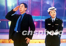 中國相聲演員馮鞏(左)與電視主持人周濤,在春節聯歡晚會中合作表演相聲《馬路情歌》。作者:王新