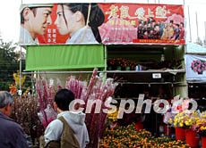 在人流多的香港維園年宵市場,港產電影“老鼠愛上貓”為加強宣傳,在花檔高高掛上宣傳海報。鄧慶樂 攝