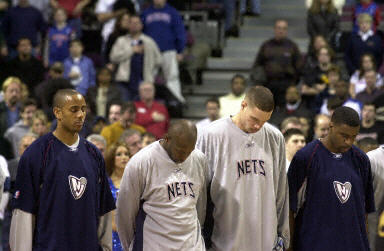 美國航天飛機哥倫比亞號于北京時間昨天晚間失事,機上全部7名宇航員全部罹難。圖為美國NBA比賽開始前,新澤西網隊隊員為遇難者進行默哀。他們在今天比賽中的對手是底特律活塞隊。