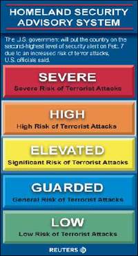 中新網2月8日電 美國當地時間7日已宣布將全國戒備級別提高至二級。據國際在線報道,在美國政府召開的國家安全會議上,布什總統根據安全官員的建議,決定提高有關恐怖襲擊威脅的警告級別,即把黃色戒備狀態提高到橙色戒備狀態。