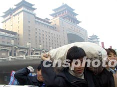 一隊(duì)肩扛大包的民工慶幸抵達(dá)了北京。據(jù)中國(guó)鐵道部春運(yùn)辦的消息,僅2月7日,中國(guó)鐵路旅客發(fā)送量達(dá)426.4萬(wàn)人次,創(chuàng)歷史新高。預(yù)計(jì)春節(jié)后第二個(gè)客流高峰將在二月中旬出現(xiàn),目前許多車站已無(wú)票可售。作者:杜洋