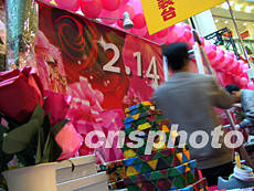二月十日,北京一家商場搭起了一排粉紅色的柜臺,為即將到來的情人節商戰作準備。作者:杜洋