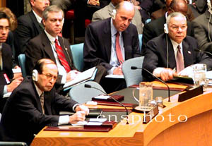 圖為伊拉克常駐聯合國代表穆罕默德.杜里(左一)與美國國務卿鮑威爾相鄰而坐聽取報告。(作者:趙海燕)