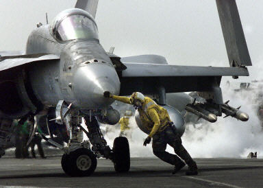 F/A-18“超級黃蜂”(SuperHornet)艦載多用途超音速戰斗機,由美國麥克唐納·道格拉斯公司制造,1995年首次飛機,裝備于“林肯”(USS Abraham Lincoln)號核動力航空母艦。