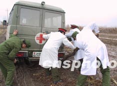 新疆地震災區三月初連日雨雪天氣,道路泥濘,極大地影響了救援速度。圖為解放軍第十二醫院災區醫療隊的救援車在途中被困。作者:閆文陸