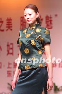 十二日,在上海東華大學舉行的一場時裝秀上,東華大學學生展示一款由學生自己設計的唐裝,獨具風韻。作者:湯彥俊
