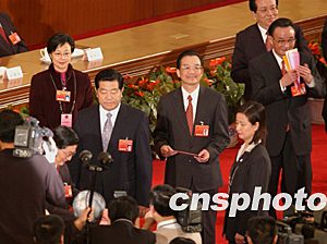 握手、鞠躬、揮手致意。肩負著歷史重任的中國新領(lǐng)導人以不同的方式表達著對人民代表的衷心感謝。