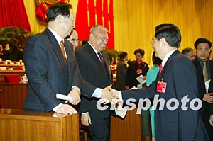 十屆人大一次會議十八日上午在北京人民大會堂閉幕,胡錦濤主席向參加閉幕會的董建華等表示問候。作者:毛建軍