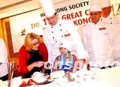 為宣傳即將在4月舉辦的"第12屆全港廚師精英大匯演",城中多位名廚18日在君悅酒店與協康會小朋友一起參與別開生面的廚藝比賽。洪少葵 攝