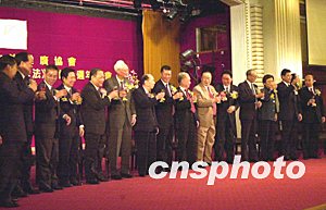 何厚鏵、原全國人大常委會副委員長王漢斌、全國政協副主席馬萬祺及中央駐澳聯絡辦主任白志健在酒會為紀念《澳門基本法》頒布十周年電視特輯首播儀式揭幕。作者:李剛