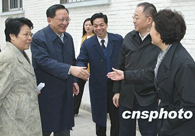 國務委員唐家璇,四月十日在北京考察僑務工作時,到北京華文學院看望華僑學生的生活。中新社記者 毛建軍 攝