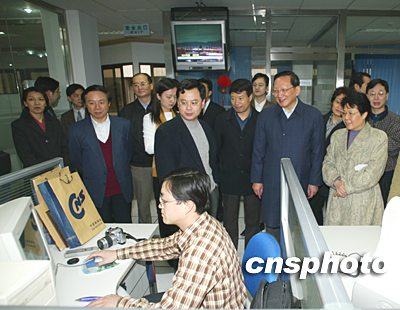 在中新網新聞中心,唐家璇興趣盎然地瀏覽了中新網網頁,并對編輯記者們說:是你們讓這個世界變得既大又小!中新社記者 毛建軍 攝