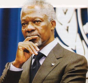“從遠(yuǎn)處來看,灰白色的頭發(fā)與胡須使得安南的臉上仿佛籠罩著一層淡淡的光環(huán)。”極富散文情調(diào)的《紐約客》雜志這樣描寫安南的臉龐。然而,近距離看過安南的人都會同意,實(shí)際上那是一張最為普通不過的臉。在任何時候,它都不會讓你感覺到它隱藏了什么,當(dāng)然你也不會從中看出什么。對于聯(lián)合國秘書長來說,擁有這樣一張臉龐恐怕最為合適不過。因?yàn)樵谶@個充滿矛盾的國際舞臺上,聽取別人而隱藏自己的意見是聯(lián)合國秘書長這個職位必備的素質(zhì)。