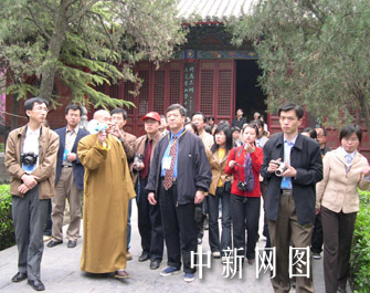 圖:洛陽白馬寺和尚為網絡媒體記者當導游