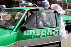 甘肅蘭州市疾病預防控制中心,近日對該市所有的士進行消毒,以預防“非典型肺炎”的發生。作者:劉呈軍