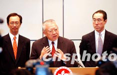 香港行政長官董建華4月23日在宣布八項救市措施時表示,政府在制定措施之前已深思熟慮,并考慮過對財赤及金融市場的影響,相信可以紓緩目前的困境,又平衡到香港的財政狀況。中新社傳真 洪少葵 攝