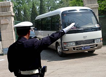 交通警察指揮北京市委書記一行的考察車進入醫院。