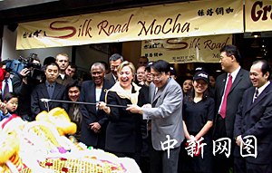 讓蔡老板開心的是今天舉行的新張儀式,聯(lián)邦參議員希拉里·克林頓成為小店新張儀式的主禮嘉賓。今天上午,希拉里與華埠人士在“絲路”咖啡屋探討振興華埠議題,在持續(xù)了數(shù)十分鐘的討論和記者會(huì)后,希拉里走到門口,拿起剪刀為咖啡屋開幕剪彩。一時(shí)間鑼鼓喧天、獅舞人笑,給冷清多日的華埠帶來(lái)了喜氣。