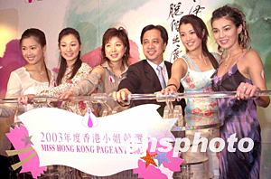 "2003年度香港小姐競選"9日在香港舉行記者會,應屆港姐冠軍林敏俐(右二)、亞軍左慧琪(右一)、季軍胡家惠(左三)等與港姐競選統籌經理何麗全攜手主持本地招募宣傳片啟播儀式。鄧慶樂 攝