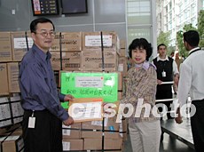 美國(guó)舊金山灣區(qū)僑胞五月初向國(guó)內(nèi)捐贈(zèng)了第二批抗非典物資,用以幫助北京醫(yī)護(hù)人員作好防護(hù)工作。圖為中國(guó)駐舊金山總領(lǐng)館代表柯亞沙(左)在舊金山國(guó)際機(jī)場(chǎng)與國(guó)航駐舊金山辦事處經(jīng)理鈕愛(ài)玲辦理交運(yùn)手續(xù)。作者:中新社