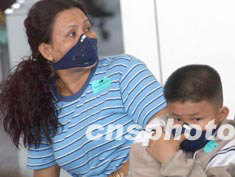 日前,在香港國際機(jī)場候機(jī)大廳,乘客依然戴妥口罩謹(jǐn)防“非典”。圖為戴口罩候機(jī)的母子。 中新社傳真 錢興強(qiáng) 攝